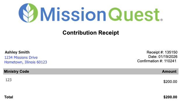 Yes. When a donor gives online, a contribution receipt is automatically emailed to them. When a donor gives by check, if Mission Quest has their email on file, a contribution receipt is automatically emailed to them once the check is processed.