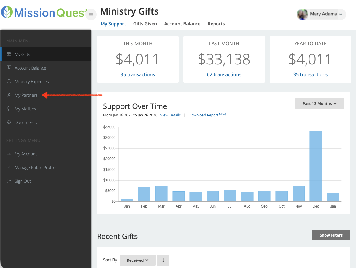 1) Log in to your missionary dashboard at https://dashboard.missionquest.org/